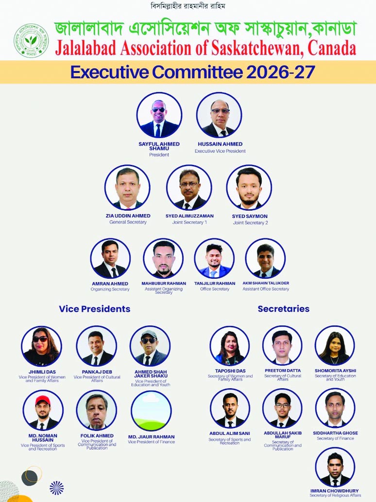হেলাল সরকার : স¤প্রতি কানাডায় জালালাবাদ এসোসিয়েশন অফ সাসকাচোয়ান এর কার্যকরী কমিটি গঠিত হয়েছে। এ উপলক্ষে সাসকাচোয়ানস্থ কনফেডারেশন ইন হোটেলে বিপুল সংখ্যক সিলেটি প্রবাসীর উপস্থিতিতে একটি সার্চ কমিটি গঠন করা হয়। সংগঠনের প্রতিষ্ঠাতা সভাপতি বাজলুর রশিদ সুইট এবং সার্চ কমিটির সভাপতি কামনাশিস দেব এর নেতৃত্বে ২০২৬-২০২৮ মেয়াদে গঠিত আংশিক কমিটির সভাপতি সাইফুল আহমেদ শামু এবং সাধারণ সম্পাদক জিয়া উদ্দিন আহমেদ কে নির্বাচন করা হয়।