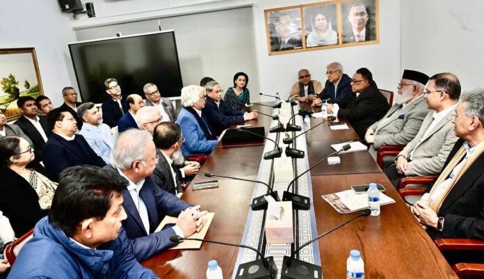 সাক্ষাৎকালে উপস্থিত ছিলেন ইন্টারন্যাশনাল চেম্বার অব কমার্স (আইসিসি) বাংলাদেশের সভাপতি মাহবুবুর রহমান, বিএসআরএমের চেয়ারম্যান আলী হোসেন আকবর আলী, এফবিসিসিআইয়ের সাবেক সভাপতি মীর নাসির হোসেন ও এ কে আজাদ, স্কয়ার গ্রুপের ব্যবস্থাপনা পরিচালক তপন চৌধুরী, বিটিএমএর সাবেক সভাপতি মতিন চৌধুরী, বাংলাদেশ চেম্বার অব ইন্ডাস্ট্রিজের (বিসিআই) সভাপতি আনোয়ার উল আলম চৌধুরী পারভেজ, মেঘনা গ্রুপ অব ইন্ডাস্ট্রিজের চেয়ারম্যান ও ব্যবস্থাপনা পরিচালক মোস্তাফা কামাল, উত্তরা মোটর করপোরেশন লিমিটেডের চেয়ারম্যান মতিউর রহমান এবং এমসিসিআইয়ের সভাপতি কামরান টি. রহমান।