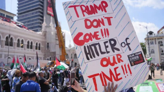 বিক্ষোভকারীরা ‘ফ্রি ফ্রি প্যালেস্টাইন’সহ নানা স্লোগান ও প্ল্যাকার্ড হাতে সেখানে অবস্থান করেছেন। একটি প্ল্যাকার্ডে লেখা ছিল- ‘আমাদের সময়ের হিটলার ডোনাল্ড ট্রাম্প।’ আরেকটি ব্যানারে লেখা ছিল- ‘ট্রাম্প, আপনি মালয়েশিয়ায় স্বাগত নন।’
