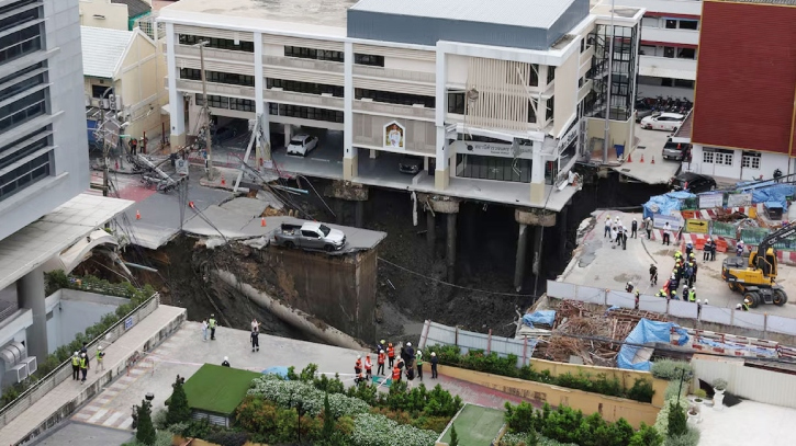অনলাইন ডেস্ক : থাইল্যান্ডের রাজধানী ব্যাংককে হঠাৎ করে সড়কের মাটি ধসে এক বিশাল সিঙ্কহোলের সৃষ্টি হয়েছে। এই সিঙ্কহোলে তিনটি যানবাহন তলিয়ে গেছে। এতে আশপাশের হাসপাতাল ও স্থানীয় বাসিন্দাদের সরিয়ে নেওয়া হয়েছে। তবে এ ঘটনায় কেউ হতাহত হননি।