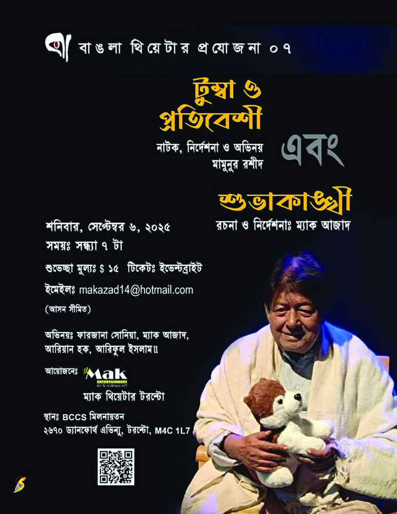 নিজস্ব প্রতিবেদক : বাংলাদেশের প্রখ্যাত নাট্যকার, নির্দেশক ও অভিনেতা মামুনুর রশীদ এর উত্তর আমেরিকা ভ্রমণের এই পর্যায়ে আগামী ৬ সেপ্টেম্বর, শনিবার সন্ধ্যা ৭টায় ম্যাক থিয়েটার টরন্টোর আয়োজনে টরন্টোর ২৬৭০ ড্যানফোর্থ এভিনিউ’র বাংলাদেশ সেন্টার (বিসিসিএস) এ তাঁর একক নাটক ‘তুম্বা ও প্রতিবেশী’ মঞ্চস্থ হবে। ‘তুম্বা ও প্রতিবেশী’ মঞ্চস্থ হবার পর ম্যাক আজাদের রচনা ও নির্দেশনায় মঞ্চস্থ হবে ব্যঙ্গ নাটক ‘শুভাকাঙ্খী’।